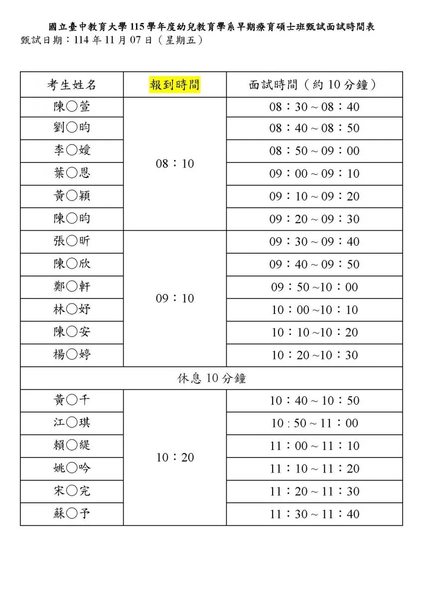 1.面試日期:114年11月7日(五) ,各考生面試時程表詳下圖所示。