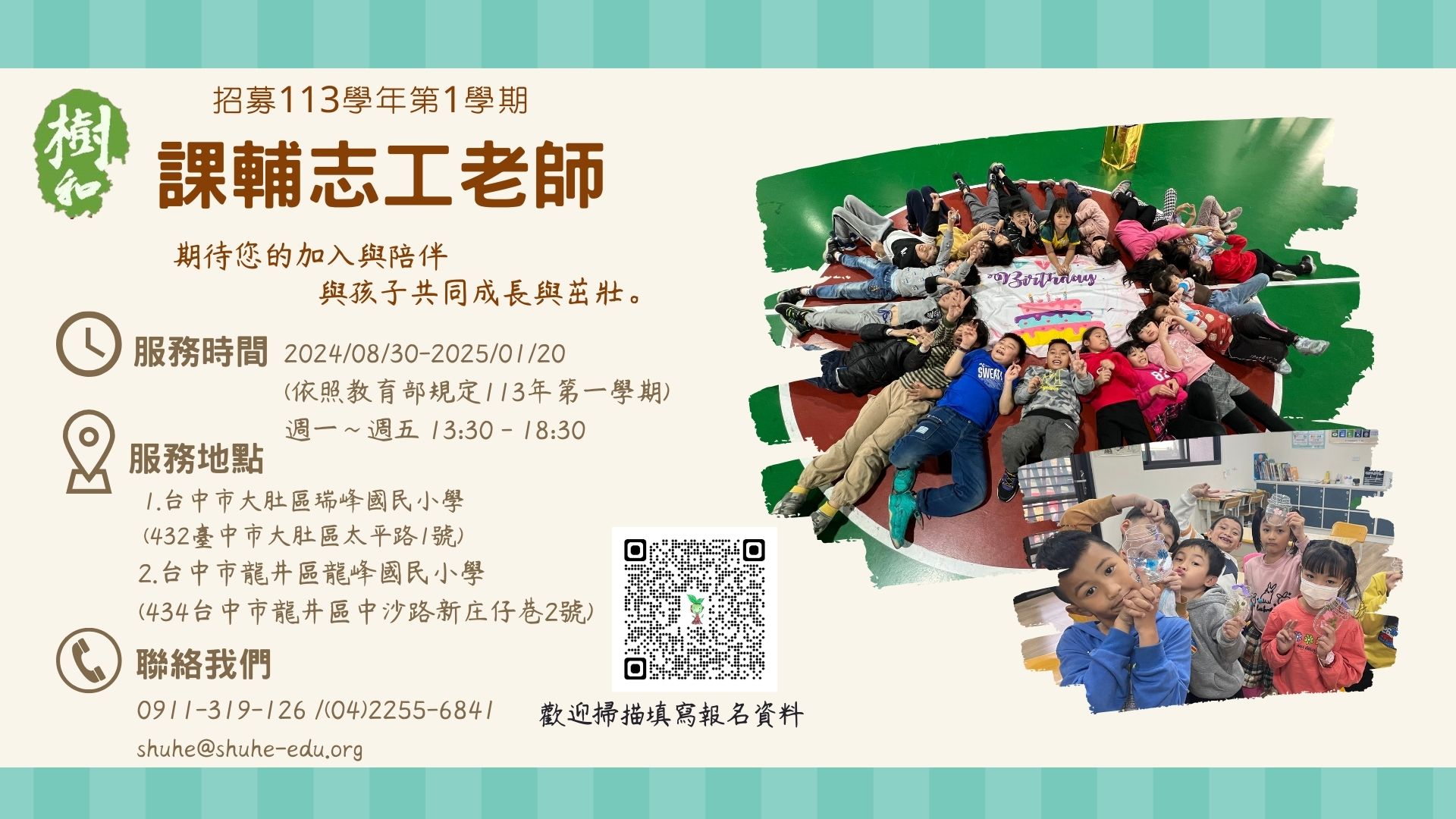 (一)服務內容:協助國小學童課後輔導、活動帶領、生活陪伴等事項。