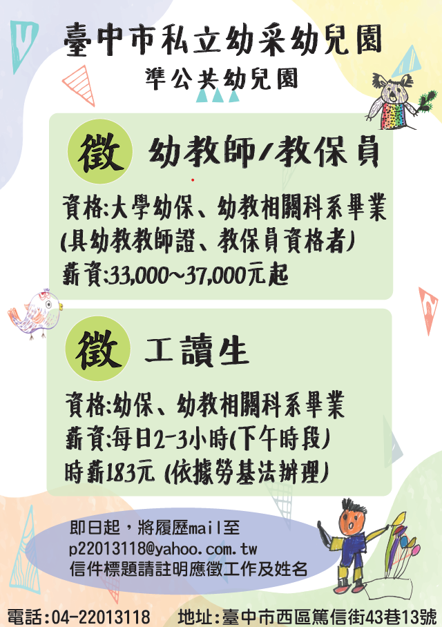 臺中市私立幼采幼兒園(準公共幼兒園) 徵 幼教師及教保員 即日起,將履歷mail至p22013118@yahoo.com.tw 信件標題請註明應徵工作及姓名 電話:04-22013118 地址:臺中市西區篤信街43巷13號