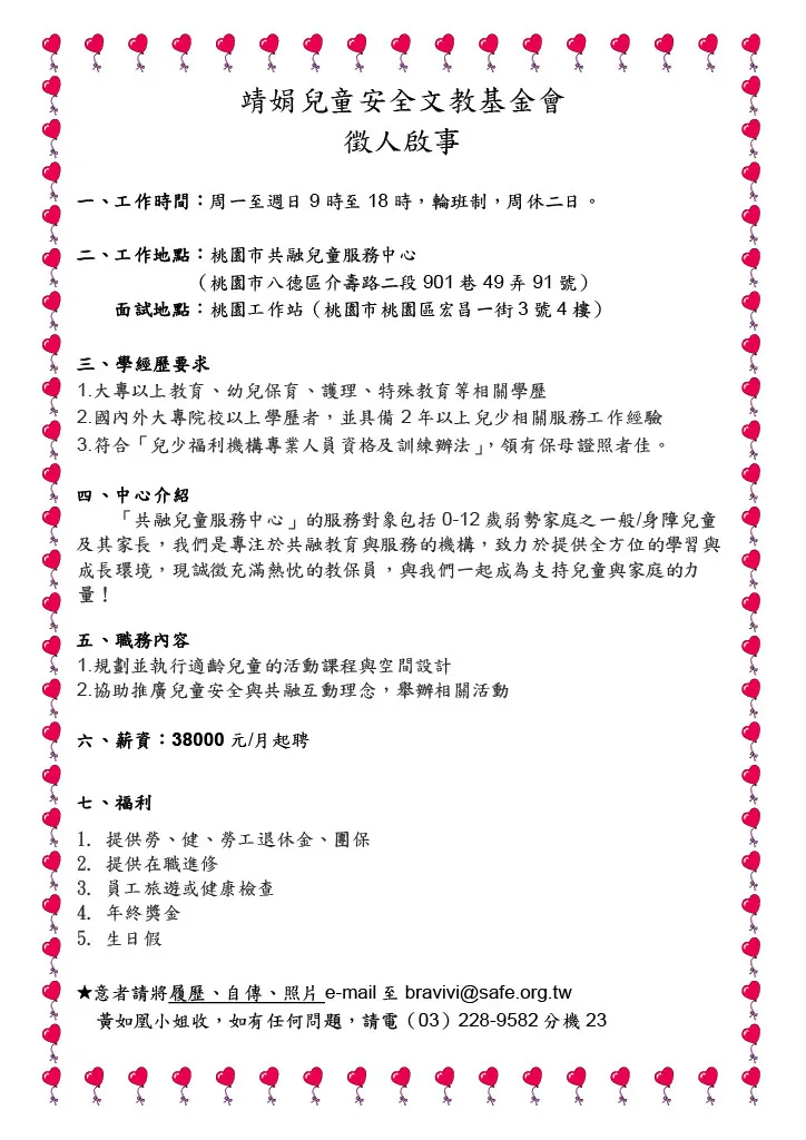 靖娟基金會徵才-桃園市共融兒童服務中心 教保員