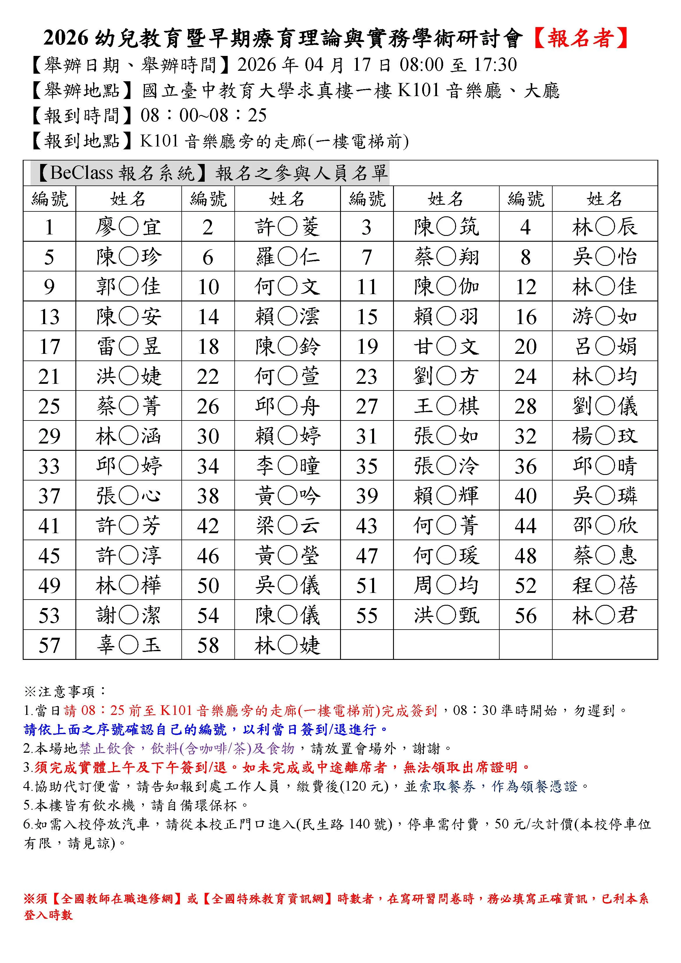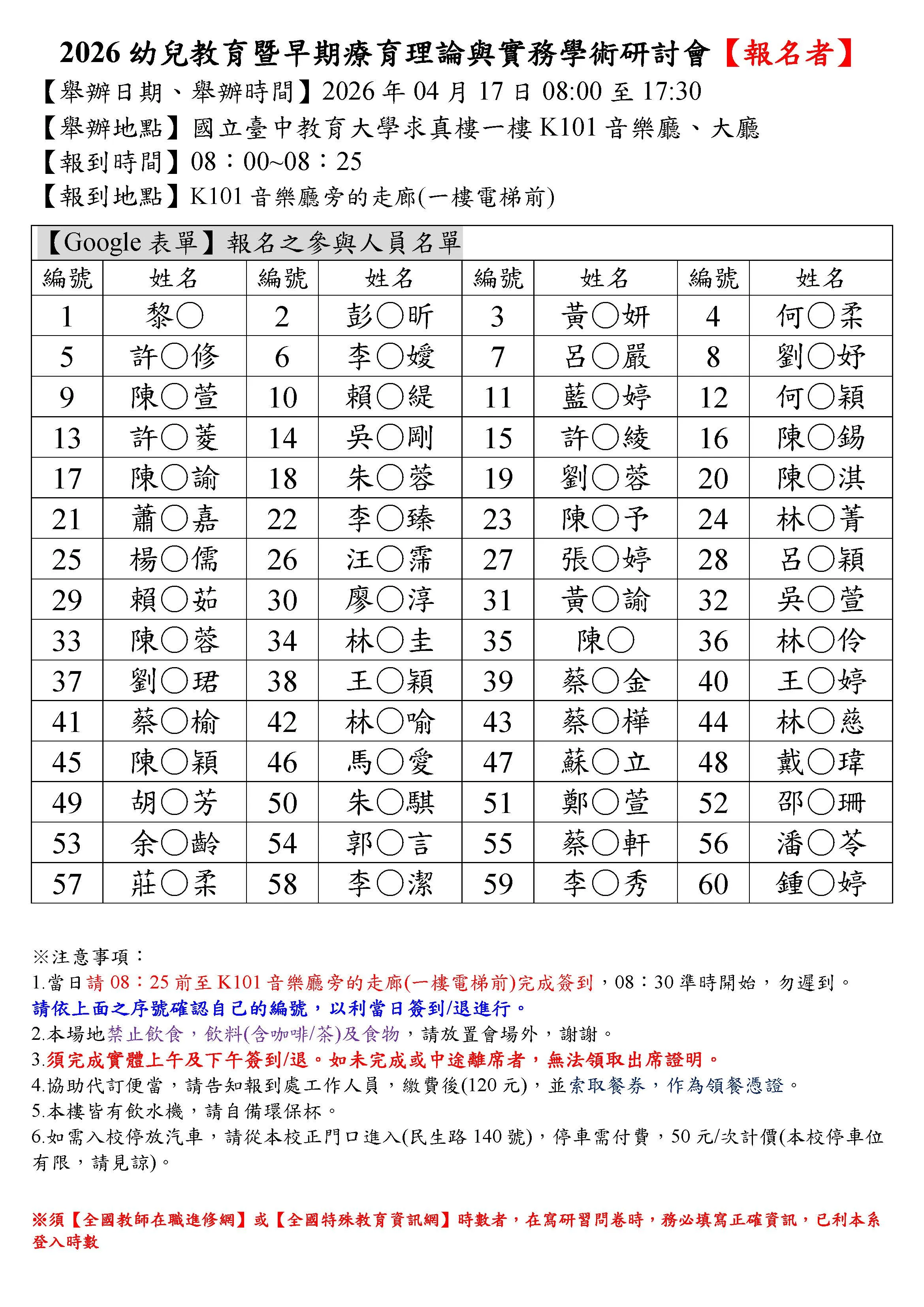 1150417幼兒教育暨早期療育理論與實務學術研討會已繳費參加者名單與行前注意事項公告