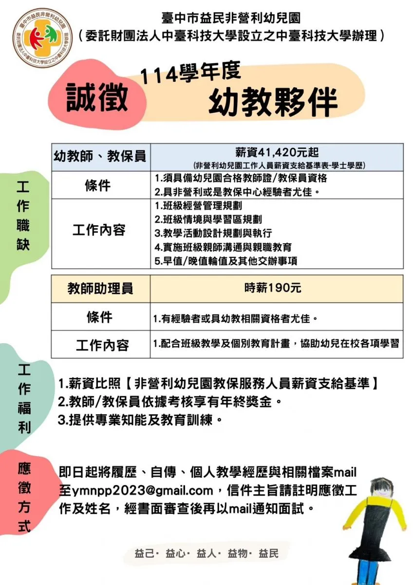 臺中市益民非營利幼兒園誠徵幼教師、教保員