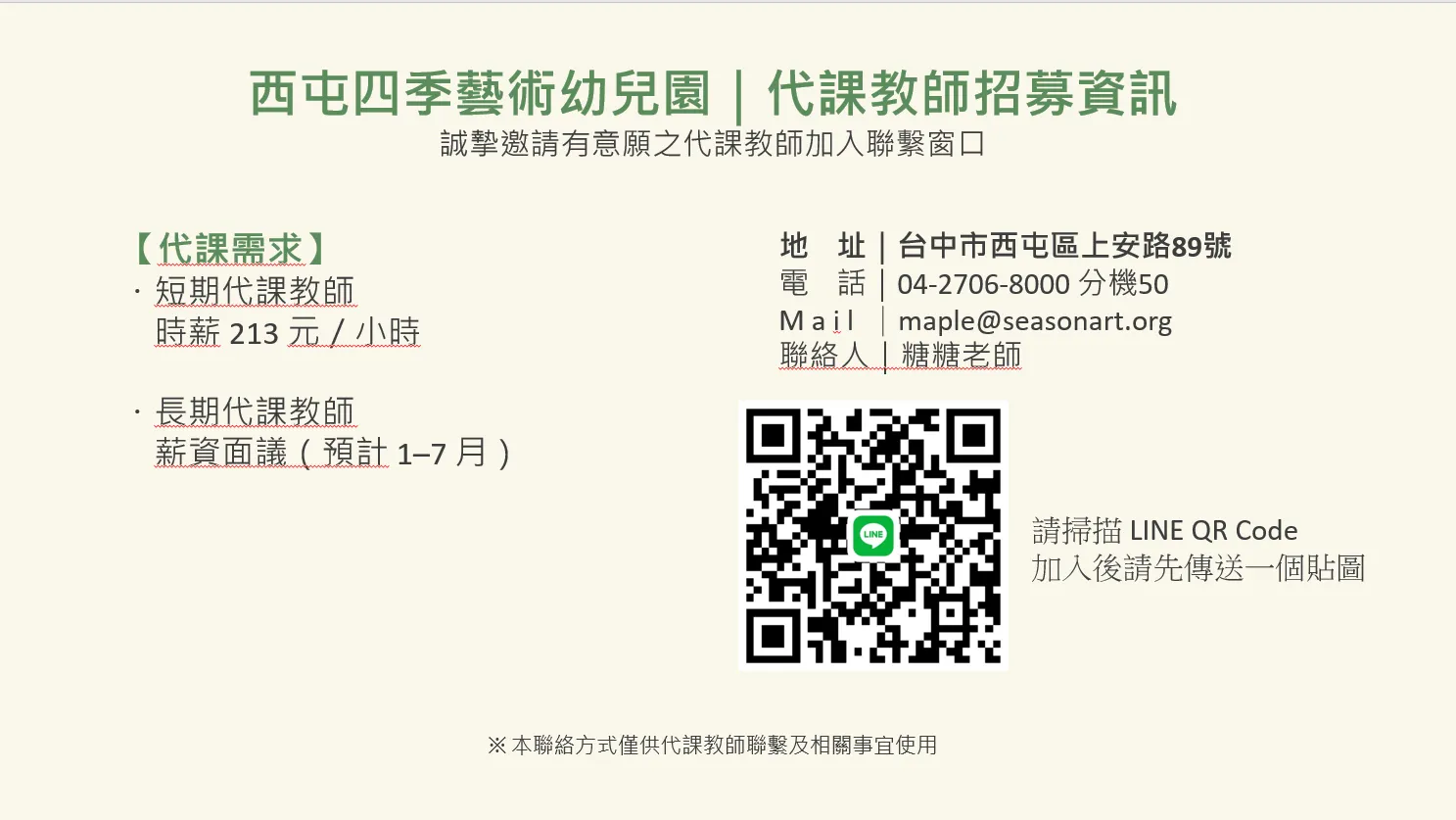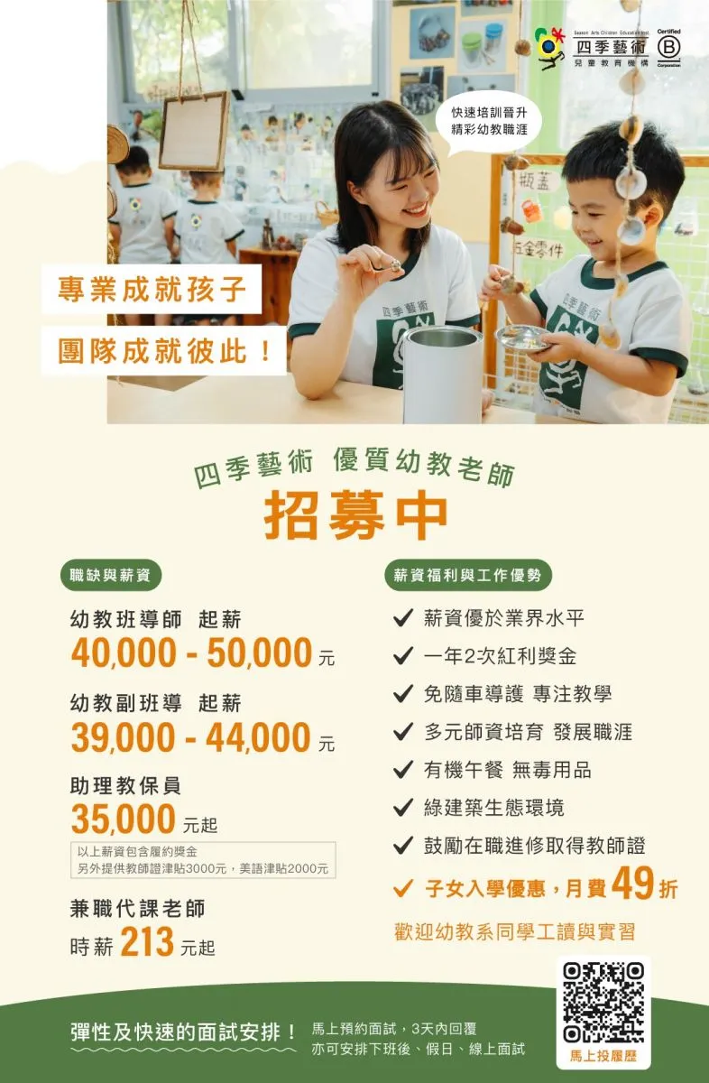四季藝術幼兒園誠徵幼教師、代課教師